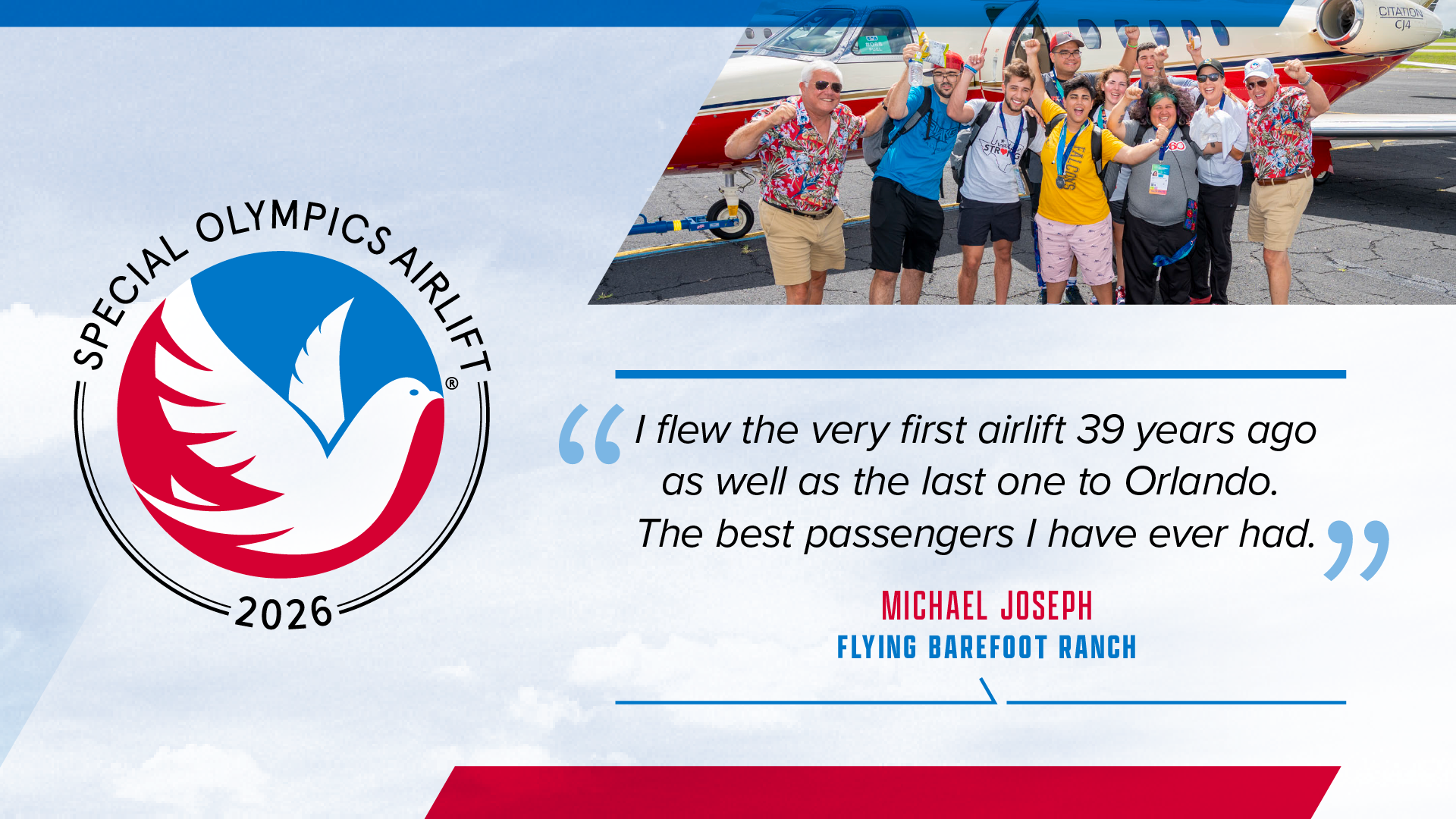 Michael Joseph of Flying Barefoot Ranch has been a longtime supporter of the Special Olympics Airlift, having flown in the first official airlift 39 years ago. He has returned to support multiple events, including the most recent flight to Orlando in a Cessna Citation CJ4. His reflections speak volumes about the impact of the experience.